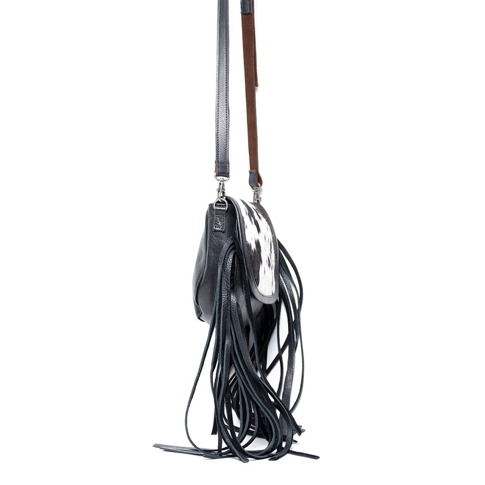 Piel 100% Bovino. Forro Poliester/Algodón. Herraje Metálico reforzado y cierre ykk. Aplicación tira pelo de vaca. Piel Flor entera.